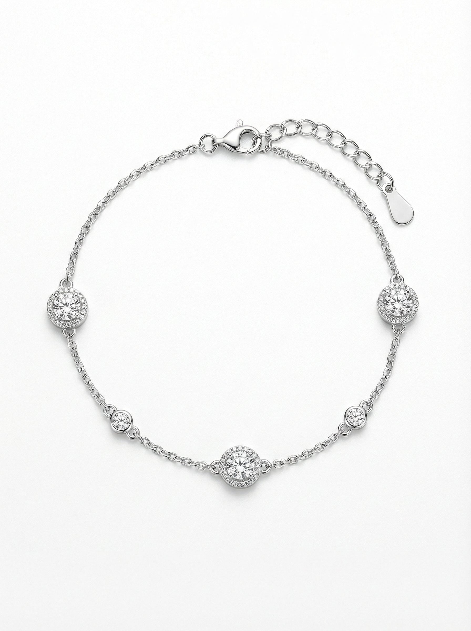 Strălucire clasică, redefinită pentru femeia modernă. Această brățară distinsă, realizată din Argint 925, este construită în jurul a trei elemente centrale de tip "Halo". Fiecare dintre acestea prezintă un cristal rotund generos, înconjurat de un inel fin de pietricele mici, care îi amplifică luminozitatea. Fluiditatea designului este asigurată de cristalele solitare (în montură închisă) inserate pe lanț între elementele principale, creând o simetrie perfectă și o linie de lumină continuă pe încheietură. Este accesoriul ideal pentru ocazii speciale, completând perfect o rochie de seară sau chiar o ținută de mireasă.