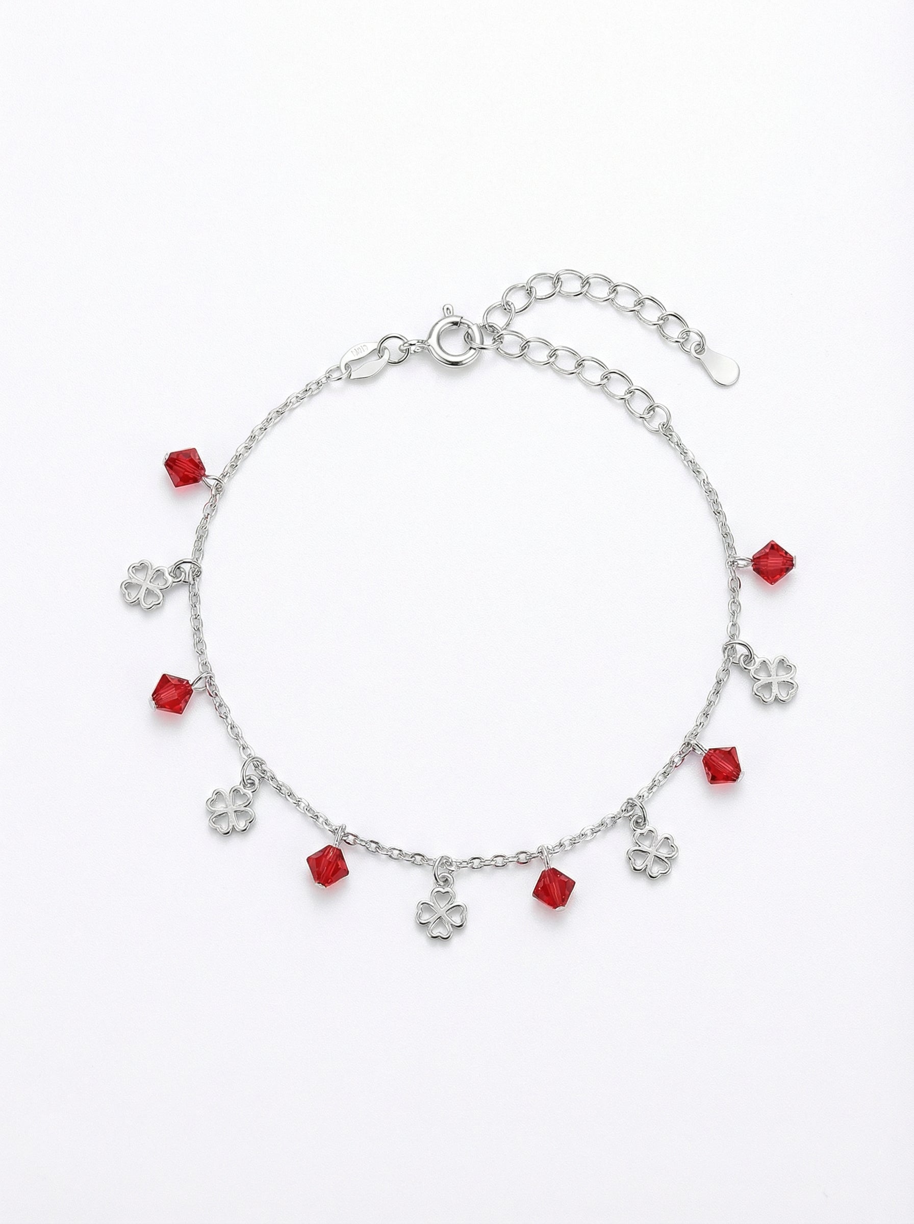 Energie pozitivă și o notă vibrantă de culoare. Această brățară jucăușă, realizată din Argint 925, transformă norocul într-un accesoriu plin de viață. Designul este ritmat de o alternanță fermecătoare: pandantivele sub formă de trifoi cu patru foi, cu un design decupat și aerisit, sunt intercalate cu cristale roșii fațetate (tăietură biconică). Culoarea rubinie intensă a cristalelor contrastează superb cu strălucirea rece a argintului, oferind bijuteriei un aer tineresc și dinamic. Este accesoriul ideal pentru a adăuga un strop de pasiune ținutelor de zi sau pentru a fi oferită ca un talisman aducător de noroc și iubire.
