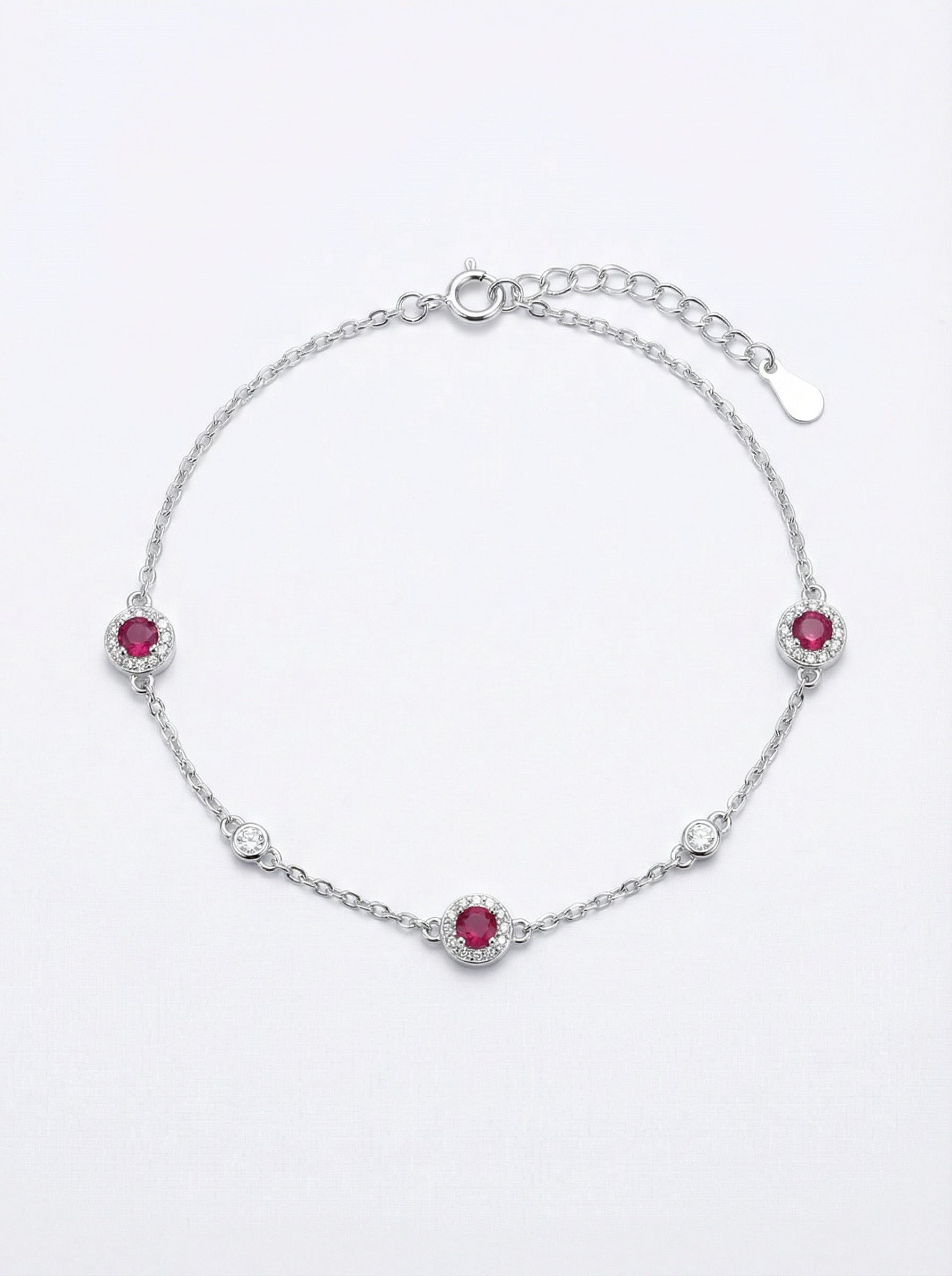 Pasiune și eleganță regală, surprinse într-o bijuterie atemporală. Această brățară rafinată, realizată din Argint 925, impresionează prin contrastul dintre strălucirea rece a metalului și căldura pietrelor centrale. Designul este ritmat de trei elemente spectaculoase de tip "Halo": un cristal central de un roșu rubiniu intens, înconjurat de un cerc perfect de pietricele transparente minuscule. Pentru a oferi fluiditate și luminozitate întregii piese, între elementele roșii sunt intercalate cristale solitare albe, montate în casete discrete de argint. Este accesoriul ideal pentru a completa o ținută de seară sau pentru a fi oferită cadou persoanei iubite.