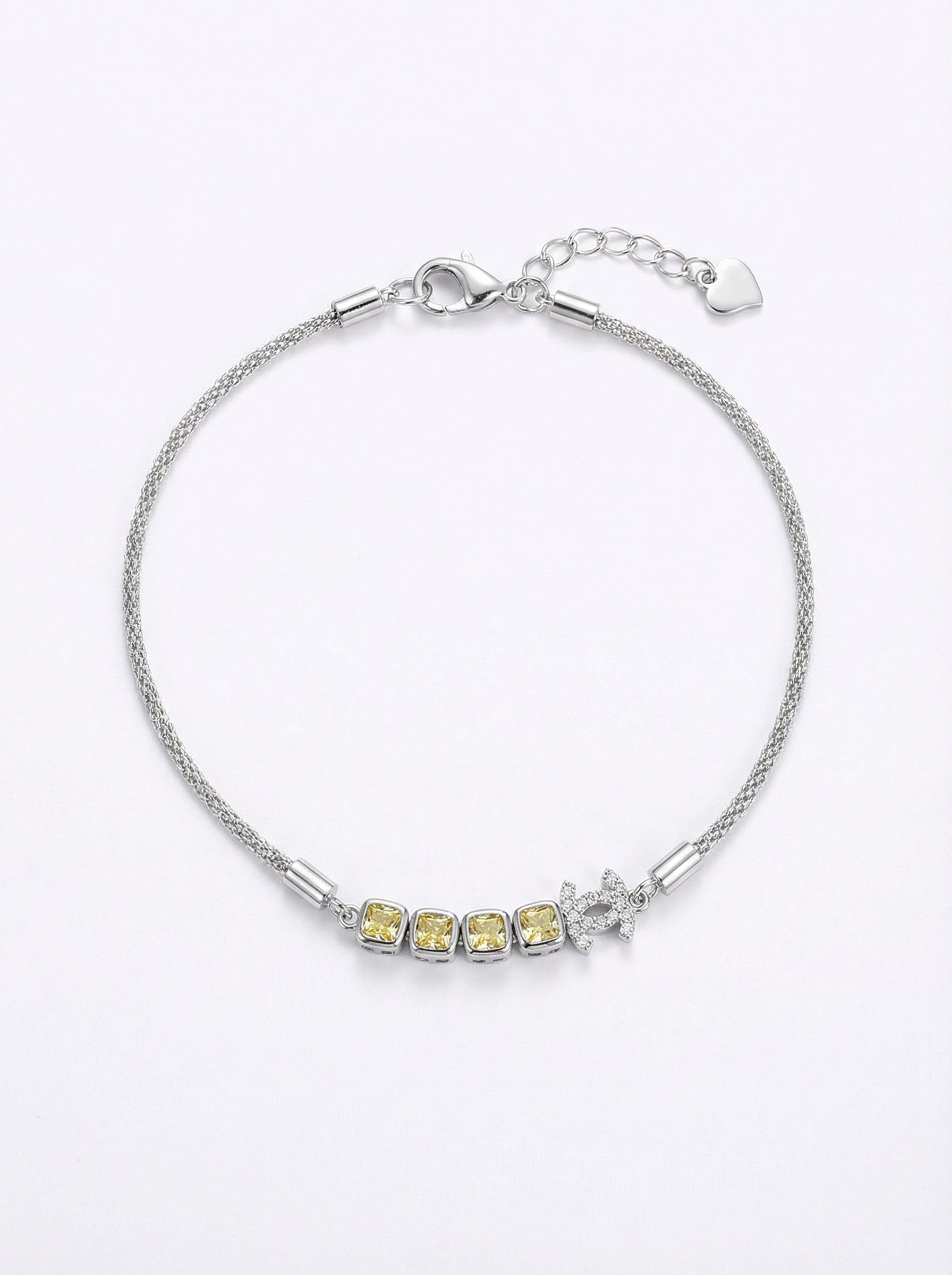 O doză de energie solară și rafinament modern. Această brățară din Argint 925 se distinge prin lanțul său de tip "mesh" (țesut/plasă), care are o textură cilindrică deosebită și se așază fluid pe încheietură. Punctul de atracție este bara centrală decorată cu patru cristale pătrate, de un galben intens (similar citrinului), care emană căldură și optimism. Designul este completat asimetric de un simbol geometric (linii curbe întrepătrunse), pavat cu mici cristale albe, care adaugă o notă de strălucire sofisticată. Este accesoriul perfect pentru a scoate din anonimat o ținută monocromă sau pentru a adăuga un strop de lux ținutelor de zi.