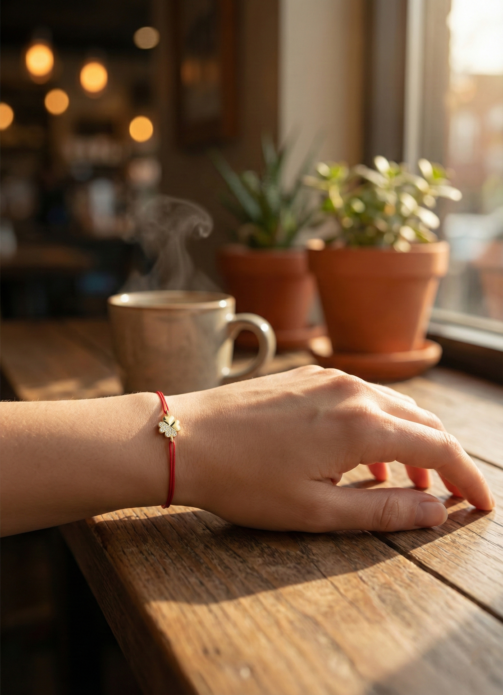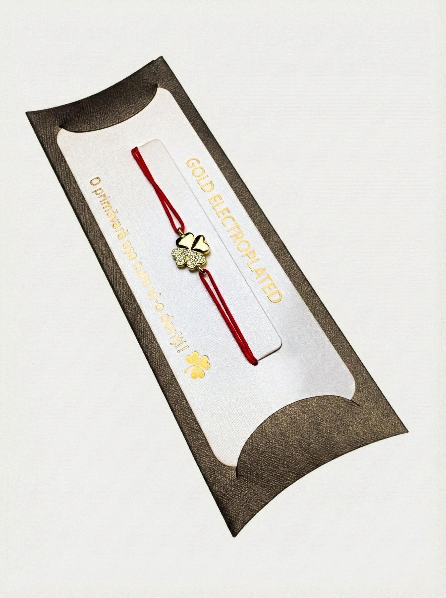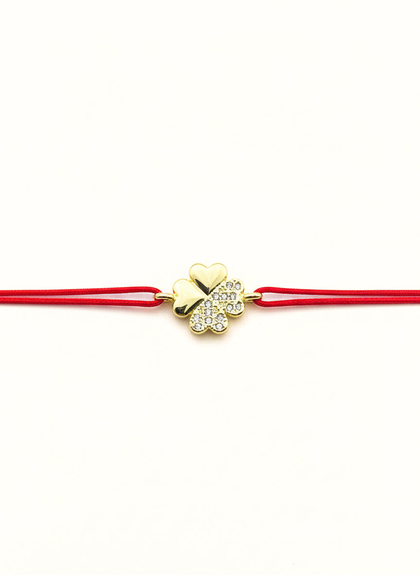 Un simbol universal al șansei, purtat acum cu eleganță la încheietura mâinii. Talismanul central, sub forma unui trifoi cu patru foi, impresionează prin designul său echilibrat: două petale finisate în auriu lucios și două pavate cu cristale strălucitoare. Prins pe șnurul roșu protector, acest accesoriu este menit să atragă oportunitățile fericite și să îți poarte noroc la fiecare pas.