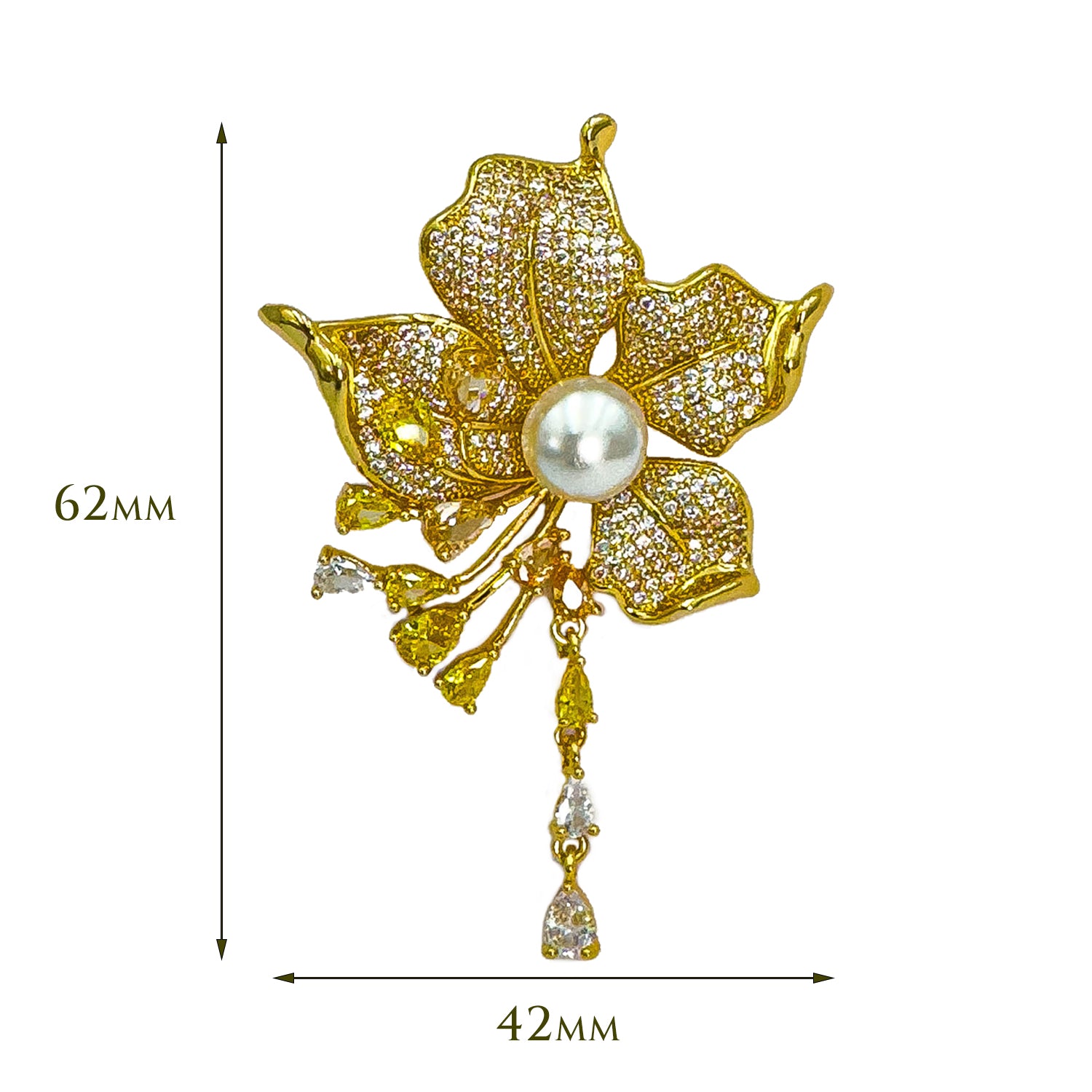 Un accent regal pentru ținute memorabile. Această broșă realizată din metale comune, electroplacată cu aur, este o veritabilă operă de artă în miniatură. Designul surprinde o floare exotică deschisă, ale cărei petale sunt pavate cu o multitudine de pietricele strălucitoare, ce captează lumina din orice unghi. Centrul florii este dominat de o perlă impunătoare, sidefată, simbol al eleganței clasice. Farmecul piesei este desăvârșit de elementele "curgătoare" – lănțișoare fine terminate cu cristale tip picătură, care adaugă mișcare și dinamism fiecărui pas. Este accesoriul ideal pentru reverul unui sacou, o eșarfă de mătase sau o rochie de seară.