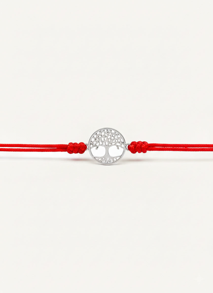Rădăcini adânci pentru un viitor înalt. Talismanul din Argint 925 ilustrează cu finețe "Copacul Vieții", simbolul universal al familiei, al creșterii și al legăturii indestructibile dintre generații. Designul este realizat prin decupaje precise (tehnică "open-work"), lăsând pielea să se întrevadă printre ramurile și rădăcinile stilizate, ceea ce oferă bijuteriei un aspect aerisit și delicat. Prinsă pe șnurul roșu protector, această brățară este un memento emoționant că, indiferent unde te poartă viața, rădăcinile tale rămân mereu cu tine.