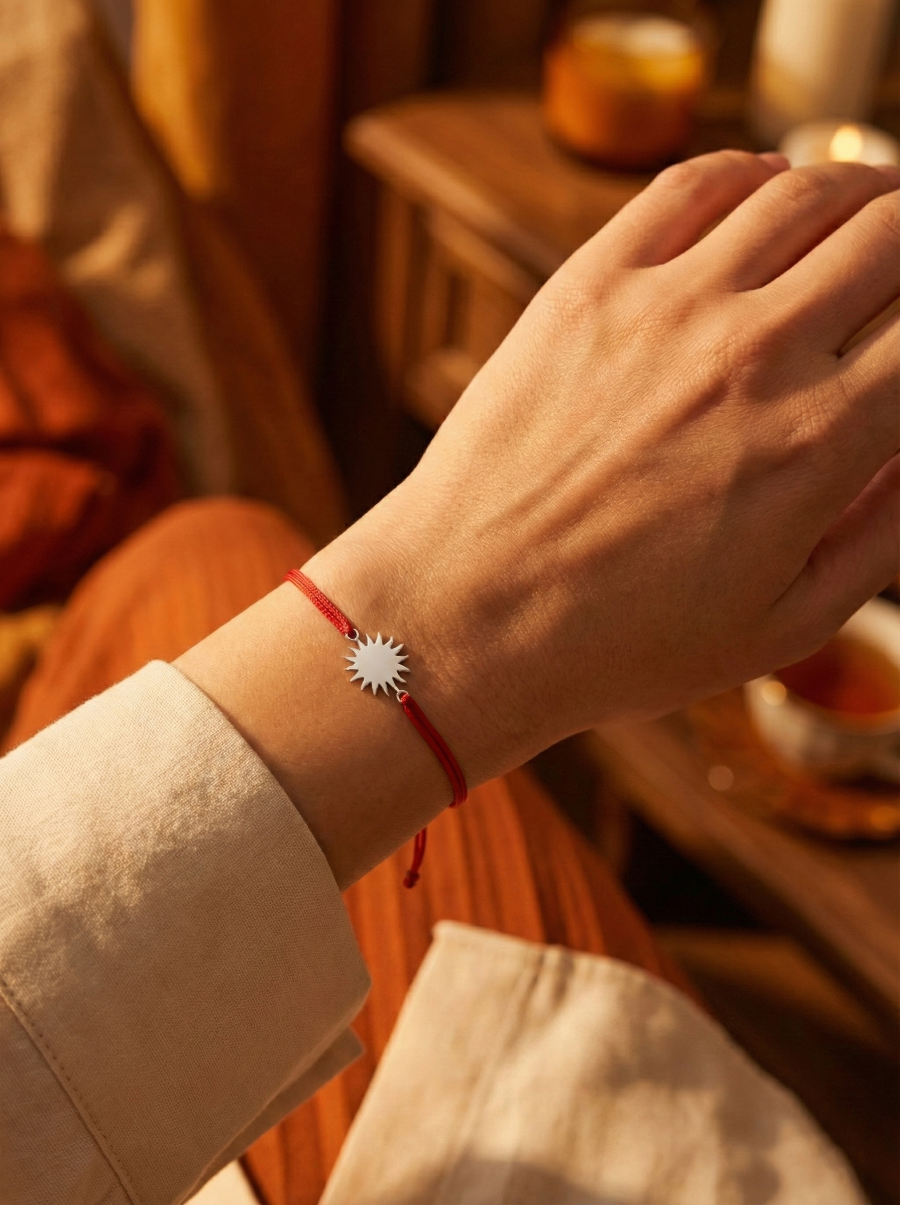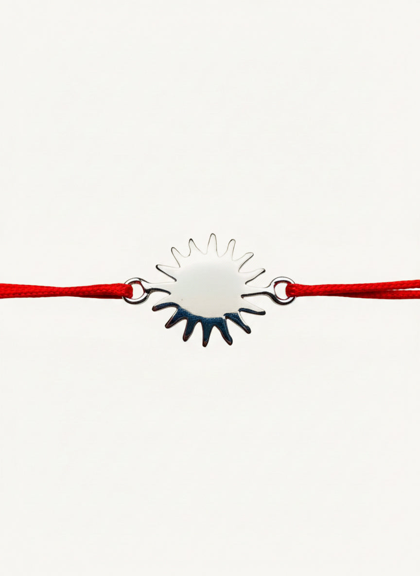 O piesă de o claritate absolută, ce emană forță și pozitivitate. Talismanul din Argint 925 surprinde esența soarelui într-o formă pură: un disc plin, cu raze geometrice bine definite și un finisaj lucios, tip oglindă. Lipsa pietrelor transformă această bijuterie într-un captator de lumină naturală, reflectând strălucirea din jur la fiecare mișcare. Prinsă pe șnurul roșu, brățara este un memento zilnic să îți lași lumina interioară să strălucească, simplu și autentic.