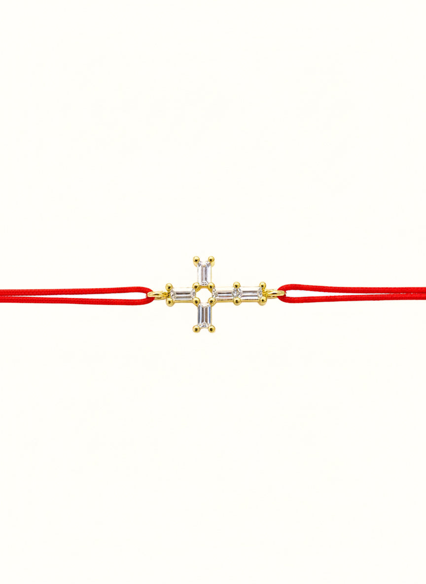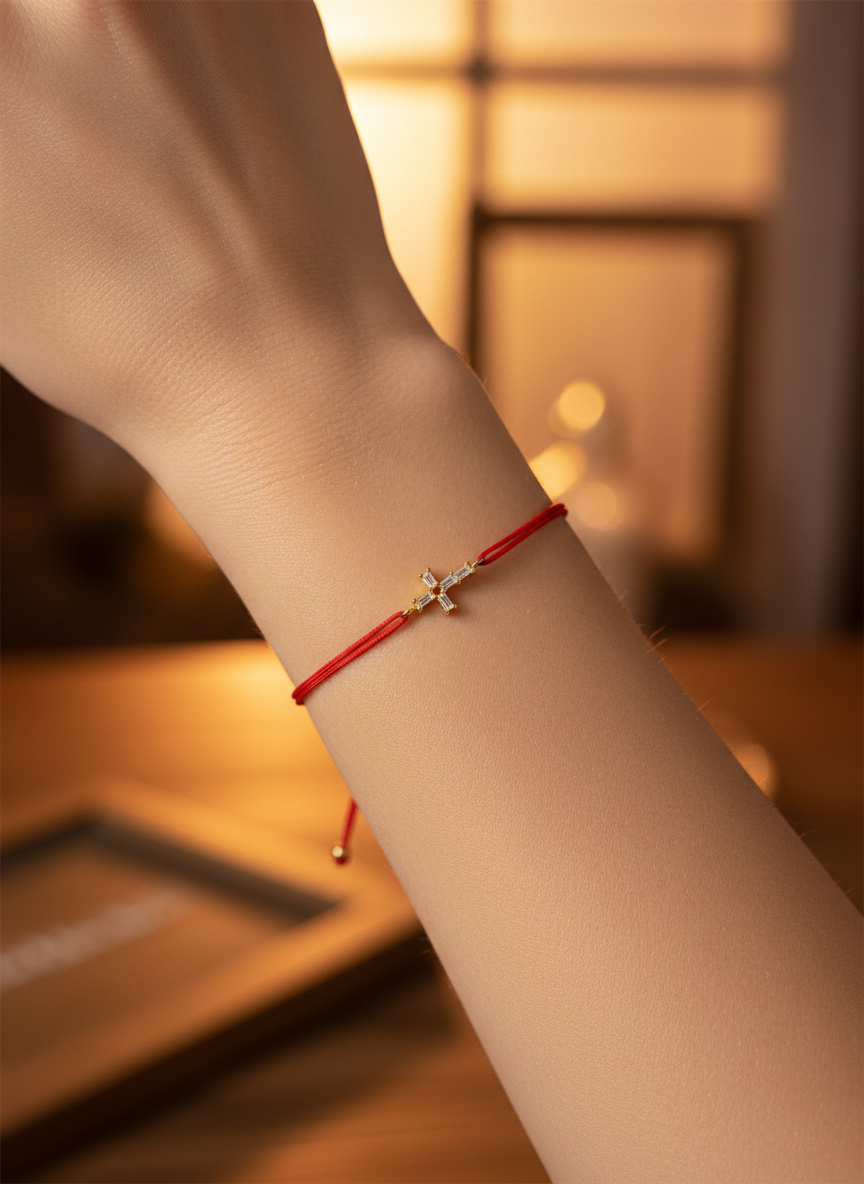 Un model ce redefinește eleganța prin linii clare și o simbolistică modernă. Talismanul central este compus din două romburi întrepătrunse: unul finisat în auriu lucios, ce reflectă simplitatea, și celălalt pavat cu cristale discrete, adăugând o notă de prețiozitate. Acest design geometric, așezat pe șnurul roșu, simbolizează echilibrul perfect și legăturile care ne completează, fiind accesoriul ideal pentru o ținută contemporană și stilată.