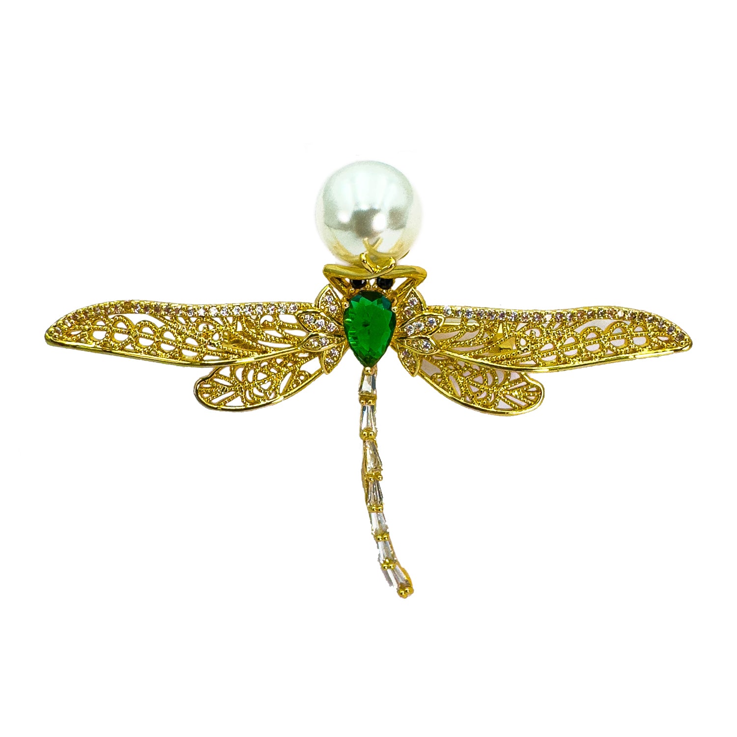 Grație și mișcare surprinse într-un accesoriu rafinat. Această broșă realizată din metale comune, electroplacată cu aur, are forma unui fluture stilizat, cu aripi dantelate conturate fin de pietricele strălucitoare. Corpul central este marcat de cristale fațetate, însă nota distinctivă este dată de cele trei perle care atârnă liber în partea inferioară. Aceste elemente mobile oferă dinamism și un aer jucăuș bijuteriei la fiecare pas. Este accesoriul perfect pentru a înveseli reverul unui sacou sau pentru a fi prins pe o eșarfă fină.