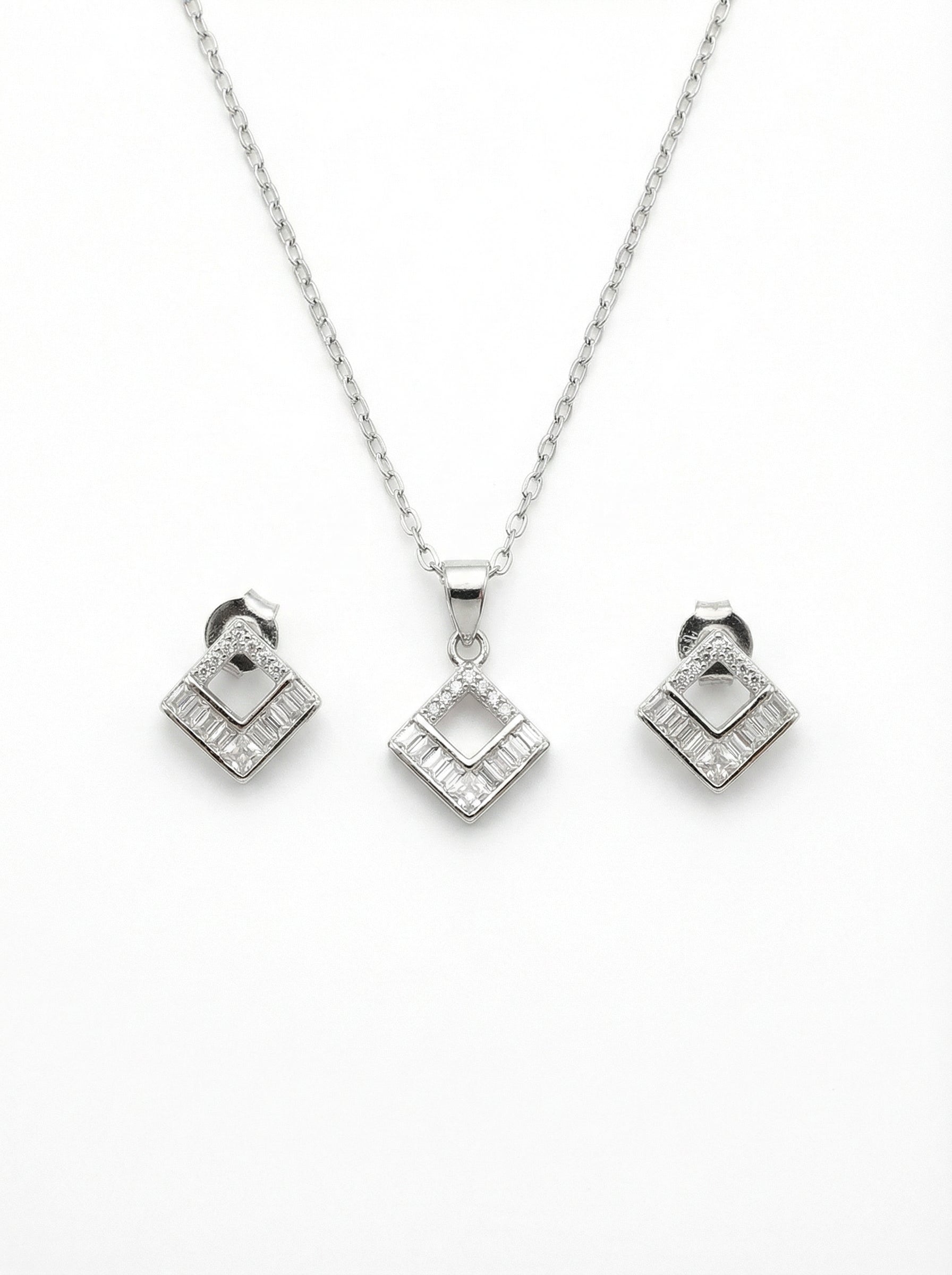 Armonie geometrică și strălucire sofisticată. Acest set rafinat, realizat integral din Argint 925, propune un design modern sub formă de romb deschis, care captează lumina din toate unghiurile. Eleganța pieselor constă în combinația inedită de tăieturi ale cristalelor: partea superioară este decorată fin cu pietre rotunde (micro-pavé), în timp ce baza este definită de cristale rectangulare (tăietură baghetă), care oferă o claritate și o structură deosebită. Setul conține un lanț cu pandantiv și o pereche de cercei asortați (tip stud), fiind alegerea ideală pentru a completa o ținută office sau o rochie de seară cu un accent de lux discret.