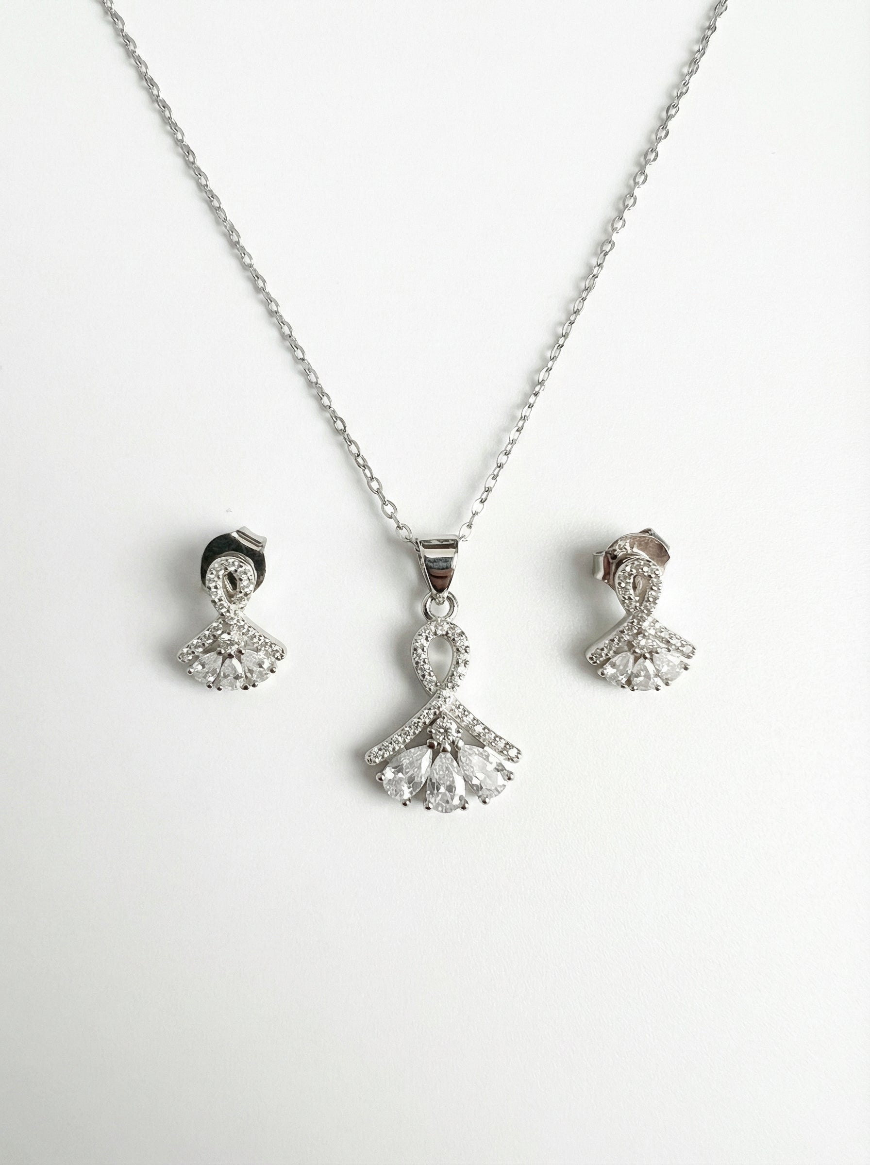 Strălucire regală și eleganță atemporală. Acest set superb din Argint 925 impresionează prin designul său distins, inspirat de forma unui evantai prețios. Piesa centrală îmbină armonios liniile curbe, pavate cu cristale fine, cu pietre spectaculoase tăiate în formă de lacrimă (pear cut), care radiază lumină la fiecare mișcare.