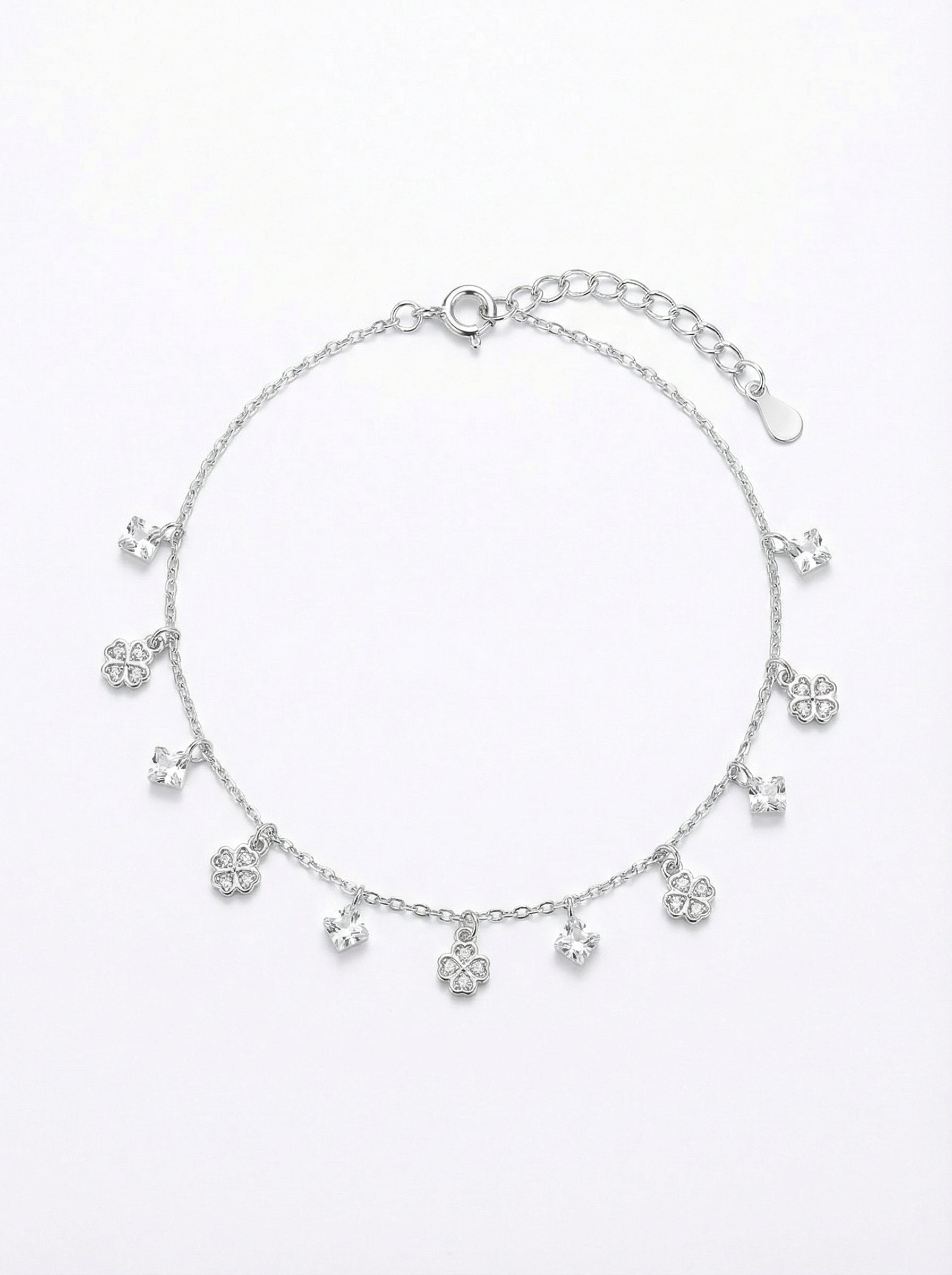 Puritate, noroc și o strălucire de diamant care se potrivește la orice. Această brățară charm, realizată din Argint 925, este definiția versatilității elegante. Designul păstrează ritmul jucăuș al colecției, alternând pandantivele sub formă de trifoi cu patru foi (pavate cu pietricele mici) cu cristale pătrate transparente, care atârnă liber pe lanț. Claritatea cristalelor oferă o luminozitate "gheață" bijuteriei, reflectând lumina naturală într-un mod spectaculos. Este accesoriul ideal de purtat zi de zi ("daily driver"), integrându-se perfect atât într-o ținută office, cât și într-una casual sau de seară, datorită nuanței sale neutre și rafinate.